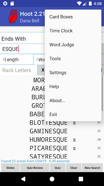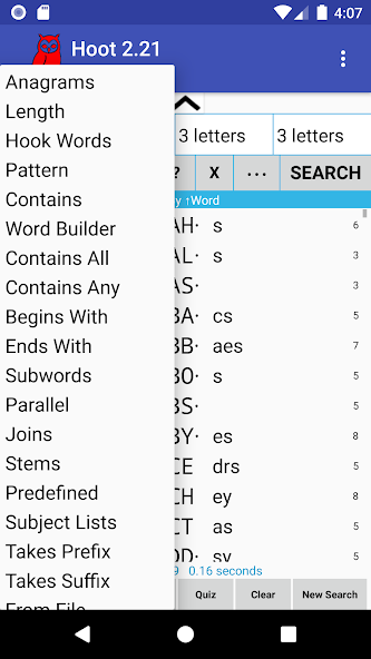 Hoot有多个搜索选项(请参见下文),并且输入屏幕可让您输入多个参数要考虑,包括字母,开始和结尾的数量。您可以使用两个规格指定排序订单(按,然后按)。结果以通用格式显示,显示钩子和内钩的得分。您可以选择显示概率和可玩性排名以及字词次数。